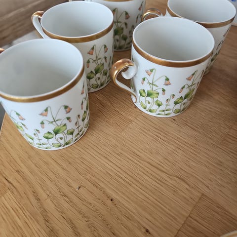 9 flotte og tilnærma ubrukte krus frå Garland / Vitromaster, med kristorn og granbar-mønster, samt grøn linje rundt toppen av koppen.