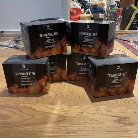 8 helt nye pakker med tennbriketter selges.
