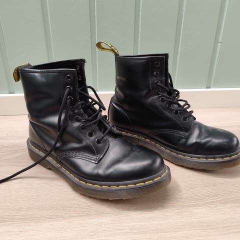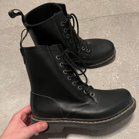 Dr. Martens regnstøvler i størrelse 39. Støvlene er svarte og har snøring foran samt hempe bak på skaftet for enklere av- og påtaking. Grovmønstret yttersåle i gummi gir godt grep på vått underlag. Modellen har et høyt skaft som dekker ankelen og oppover leggen, og er egnet til bruk i regnvær og fuktige forhold.