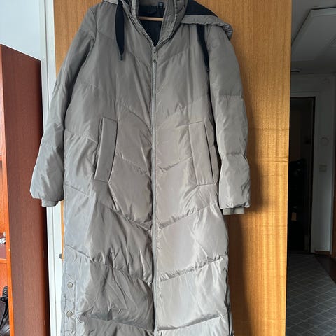 Modellen har hette, høy krage og lengde ned mot knærne, 3/4 lengde.