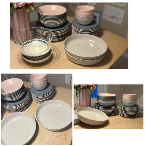 IKEA servise i lyseblått og hvitt. Settet består av tallerkener, skåler og krus i matchende farge.