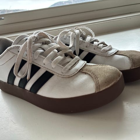 Adidas joggesko for barn, unisex. Skoene er i en lys beige farge med de karakteristiske tre svarte stripene på siden og yttersåle i gummi. Overdelen er i tekstil og syntetisk materiale med snøring foran. Passer til hverdagsbruk og lett aktivitet. Nøytral farge som kan brukes til ulike antrekk. Størrelse er ikke oppgitt – se bilder av skoene for nærmere inntrykk av modell og passform. Størrelse 36,5.