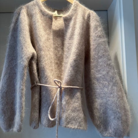 ella&il jakke for dame i størrelse L. Jakken er lys brun og laget i mohair. Den har åpen front med knytebelte i livet og lange ermer.