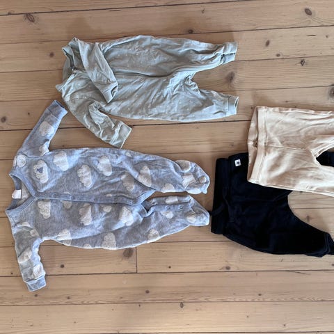 Pent brukt. 2 bukser i ull og 1 body. Hjemmestrikket romper. Merker som Newbie, Name It, Lindex, Reflex