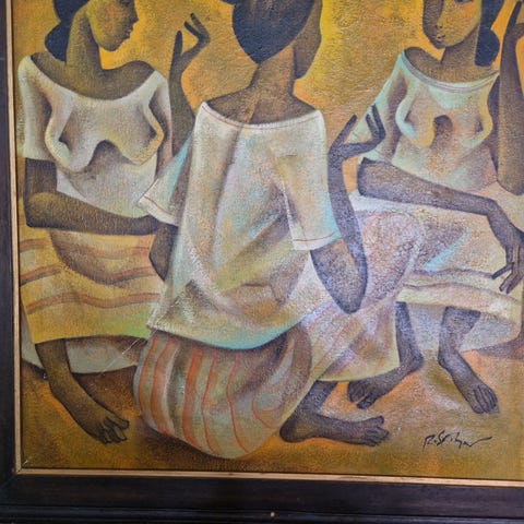 Tre batikkbilder kjøpt i kunstbutikk i Dar-es-salam i 1996. Montert på rammer av profesjonell rammebutikk i Norge. Størrelse er oppgitt på bildene. Selges kr 500 samlet eller kr 250 pr stykk pluss evt frakt. To oljemalerier på strie kan følge med på kjøpet . Disse er kjøpt av gatekunstner.