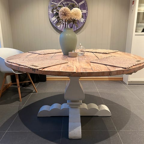 Bordet i massiv eik fremstår som nytt og er kun brukt ved noen få anledninger. Bordplaten kan demonteres.