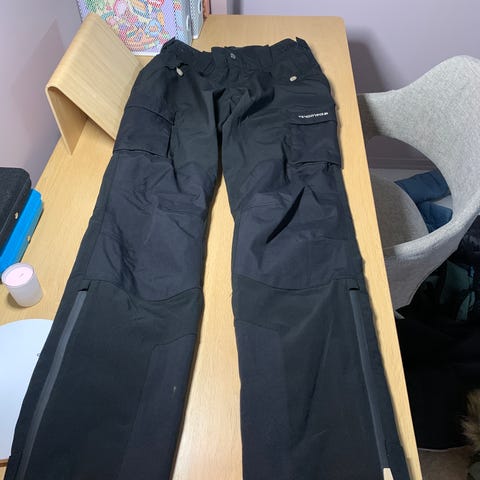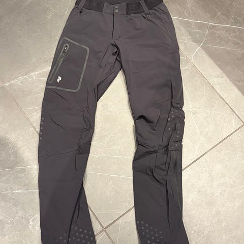 Peak Performance bukse for dame i størrelse S. Buksen er svart og laget i Gore-Tex-materiale. Den har beltehemper i livet og glidelås med knappelukking foran. Stoffet er teknisk og beregnet for bruk der det er behov for vindtett og vannavvisende egenskaper, for eksempel til friluftsliv og turbruk. Designet gir bevegelsesfrihet med formsydde knær og praktiske lommer.