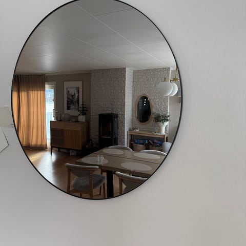 Selger 1 rundt veggspeil, pent brukt med sort ramme.