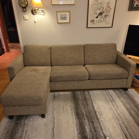 Dybden på sjeselong-delen er 157 cm, mens sofa-delen har dybde 57cm.