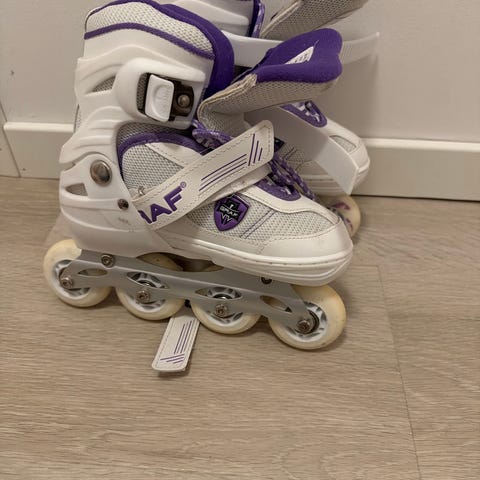 Rulleskøyter for barn i justerbar størrelse 29–33. Rulleskøytene er i fargene hvit og lilla, med høy ankelstøtte og spenner for enkel tilpasning.