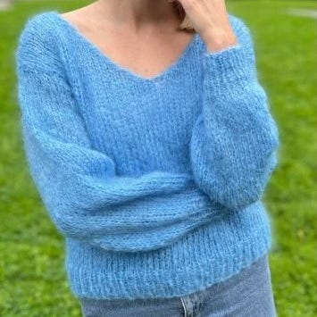 Genseren er blå/lys turkis og strikket i mohairullblanding, som gir et mykt og loddent uttrykk. Modellen har dyp v-hals, ribbestrikk nederst og på ermene, samt vide ermer.