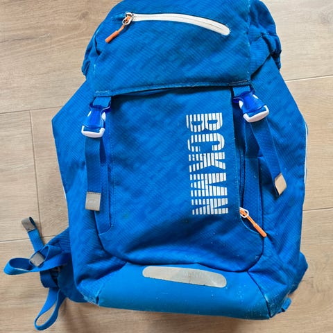 Fin skolesekk fra Beckmann selges som den er. Regntrekk følger med i topplokket på sekken.