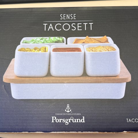 Helt nytt Porsgrund sense tacosett i eske. Består av syv deler og er ildfast, kan fryses og tåler oppvaskmaskin og mikro.