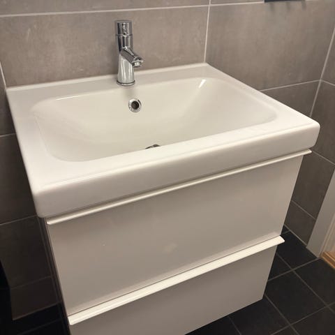 Gis bort mot henting. Nedmontert og klar til henting 9.2. Baderomssett som består av gulvstående toalett, to rektangulære servanter og innmurt badekar i matchende beige farge. Toalettet har toppmontert sisterne og standard sete. Servantene er nedfelt i baderomsmøbler med skap under. Badekaret er rektangulært og er tilpasset montering mot vegg med armatur og hånddusj på kortsiden. Alle deler er i samme beige sanitærporselen/farge og egner seg for komplett oppgradering eller utskifting av eksisterende baderomsløsning.