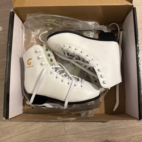 Ukjent merke justerbare barneskøyter i størrelse 35. Hvit plaststøvel med polstret innside og spenner for enkel justering og tilpasning til barnets fot. Egnet til generell skøytebruk på is for barn.