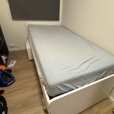 IKEA seng med integrert oppbevaring. Sengen har flere skuffer på langsiden samt åpne hyller for ekstra lagringsplass.