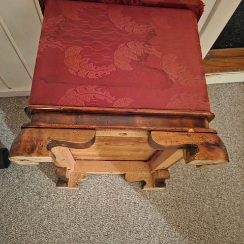 Tremøbel i kisteutførelse med oppbevaringsdel og skuffer. Møbelet er laget i brunt treverk med synlig trestruktur og dekorative beslag i metall på fronten. Underdelen har kraftige ben for stabilitet.