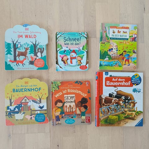 Samling med tyske bildebøker for barn. Bøkene har fargerike illustrasjoner og korte tekster på tysk, egnet for høytlesning eller for barn som lærer å lese på tysk. Innbundet format med stive permer. Passer for barnehage- og småskolealder, samt for voksne som ønsker å lese høyt for barn på tysk.
