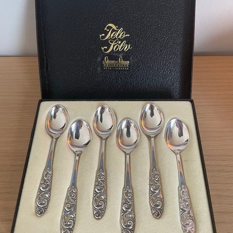 Bestikksett med ulike serveringsdeler i Telesølv 830S. Settet inneholder små gafler, skjeer, sausøse, kniver og kakespader med dekorative, ornamenterte håndtak. Leveres i esker med innvendig stofftrekk. Egnet til servering av kaker, desserter og andre retter ved borddekking.