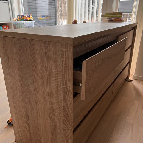 Selger en meget fin kommode i valnøtt-finish med 4 romslige skuffer. Veldig pent brukt fremstår som ny. Må hentes