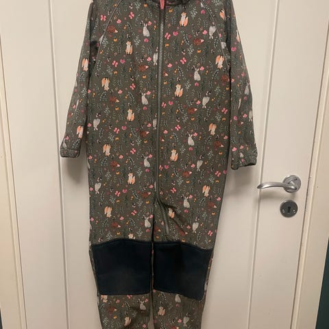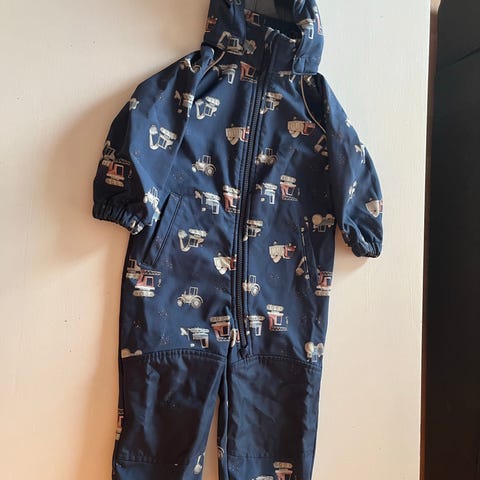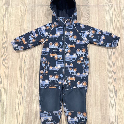 Name it parkdress/softshelldress for gutt i størrelse 110 (5 år). Dressen har et kult flerfarget mønster med kjøretøy og monstertrucks. Den har hette, lang solid glidelås foran og elastikk ved ermer og ben for bedre passform. Myk mørkeblå fleece inni. Forsterkede felt på knær og bak gir ekstra slitestyrke. Egnet som yttertøy i barnehage og til lek utendørs.