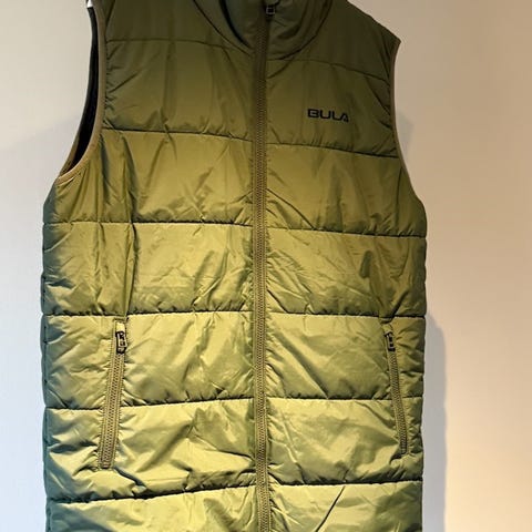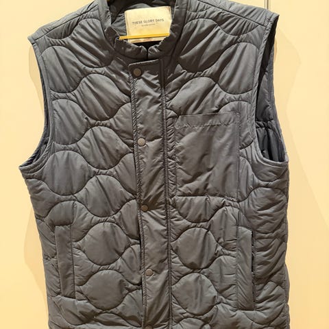 These Glory Days vest for herre i størrelse L. Vesten er grønn med vattert, quiltet mønster og kontrastfelt i mørkere stoff på skuldre og lommer. Materiale i hoveddelen er polyester. Vesten har glidelåslukking foran og flere lommer med klaff og knapp. Egnet som ytterplagg eller mellomlag i kjøligere vær.