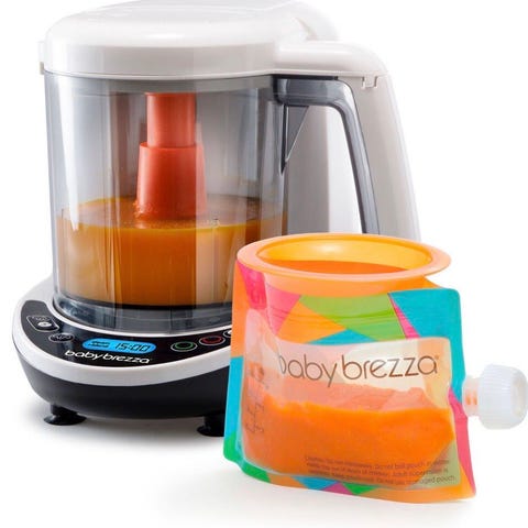 Baby Brezza One Step Baby Food Maker matlagingsmaskin for babymat i hvit plast. Enheten har integrert damper og mikser i én beholder, med gjennomsiktig bolle og oransje innsats. Frontpanelet har digitalt display og knapper for ulike funksjoner. Maskinen drives med strøm via ledning.