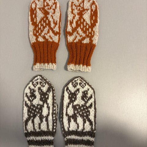 Strikka votter i rosa og hvit farge med reve mønster. Vottene har ribbestrikket vrangbord ved håndleddet for bedre passform. Egner seg til bruk på kalde dager. Barnestørrelse