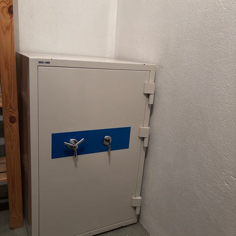 Grått verdiskap i metall med mekanisk kombinasjonslås og nøkkelhåndtak på fronten. Skapet er frittstående og har hengsler på siden. Egner seg til oppbevaring av dokumenter, kontanter eller annet utstyr som ønskes låst inn. Innvendig inndeling og eksakte mål er ikke oppgitt. Merke og modell fremgår ikke tydelig av merkeskiltet på toppen.