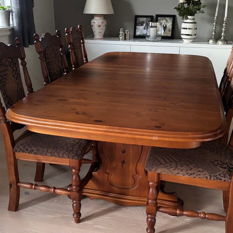 Spisestuebord i syrebeiset lakkert furu med ileggplate, total lengde 195cnm (150 + 45) med 6 stoler og kråskap, selges samlet.