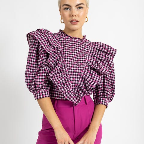 Selger en eksklusiv Bernie-skjorte fra det populære merket Custommade i fargen Festival Fuchsia. Dette er en elegant og feminin skjorte i myk bomull av høy kvalitet, med høy hals og delikate perleknapper hele veien ned foran.