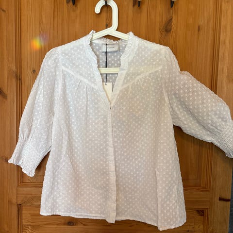 YAS bluse i hvit bomull for dame i størrelse L. Blusen har kort erm og V-utringning med knappestolpe foran. Stoffet er lett og strukturert med vevd prikkemønster. Passer til hverdagsbruk eller mer pyntede anledninger, og kan kombineres med både bukser og skjørt.