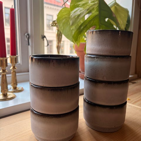 Krus i keramikk med glassert overflate. Fargeovergang fra lilla øverst til hvit nederst. Passer til innendørs bruk, for eksempel til kaffe/te eller som dekorasjon på bord eller hylle.