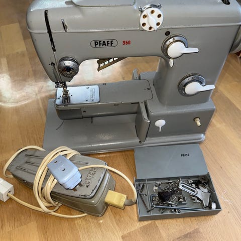 Pfaff 360 symaskin i grå utførelse. Mekanisk maskin med friarm, regulerbare innstillinger via dreiehjul på fronten og innebygd belysning ved nåleområdet. Leveres med original fotpedal og strømkabler, samt koffert med rutet innside for oppbevaring og transport. Egnet til vanlig søm og reparasjoner i hjemmet.