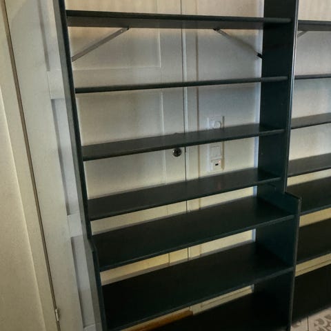 Klassisk reol i lakkert heltre furu. Består av to 5 cm dype underdeler med dører, total bredde 162 cm og høyde 80 cm. En overdel som er 20 cm dyp og 100 cm høy, 82 cm bred.