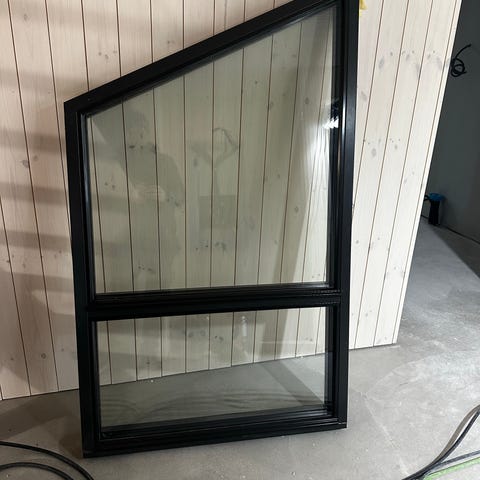H-fasade fastkarmvindu med skrå 25 grader i topp, utvendig mål ca. 99 x 213 cm. Farge utvendig og innvendig er dempet sort S8500-N. Vinduet er avbildet utenfra . Oppgitt U-verdi for hele vinduet er ca. 0,78. Vinduet er uten ventil. Egnet som fast vindu i yttervegg der man ønsker et asymmetrisk, skrått lysinnslipp.
