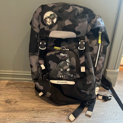 Pent brukt Becksöndergaard sekk og tilhørende penal. 30liter. Sekken er mørk blå med små mønstrede hjerter og har flere lommer med glidelås, inkludert en stor hovedlomme og en frontlomme. Den har polstrede, justerbare skulderstropper og polstret ryggpanel. På bildene følger det også med et matchende pennal i samme stoff og mønster, samt et avtagbart, neongult regntrekk med refleksdetalj. Egnet til skole, fritid og hverdagsbruk.