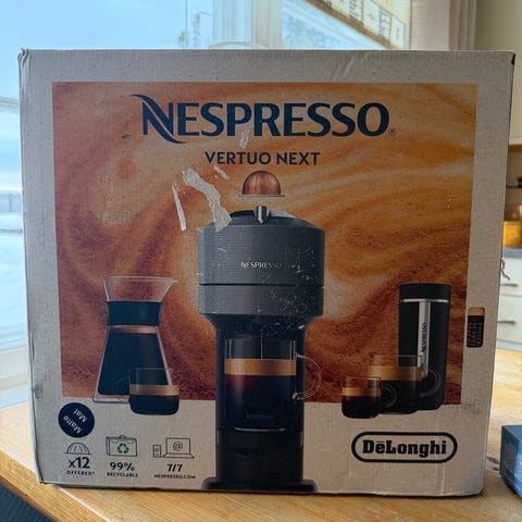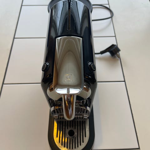 Maskinen bruker Nespresso-kapsler og har flere knapper på toppen for valg av ulike kaffedrikker.