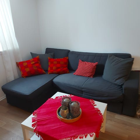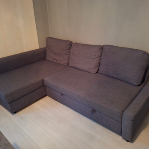 Dybde på sjeselong delen er 155 cm. En brukket planke på undersiden av sjeselong delen. (Delvis reparert og har ikke hatt noe betydning for min bruk). Ellers hel og fin. Usikker på alder og merke. Men tror den er ca 15 år gammel. Må hentes.