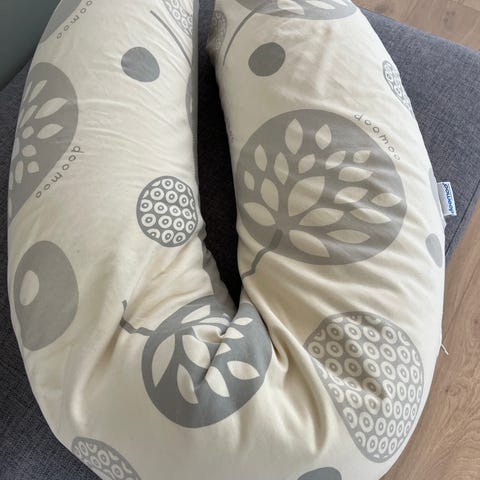 ammepute i C-form i blått trekk med lyse prikker. Puten er formet for å gi støtte rundt kroppen ved amming eller flaskemating, og kan også brukes som støttepute ved avslapning eller som ekstra støtte i seng eller sofa. Trekket ser ut til å være i mykt tekstilmateriale. Egner seg til bruk for voksne ved amming og som støttepute.