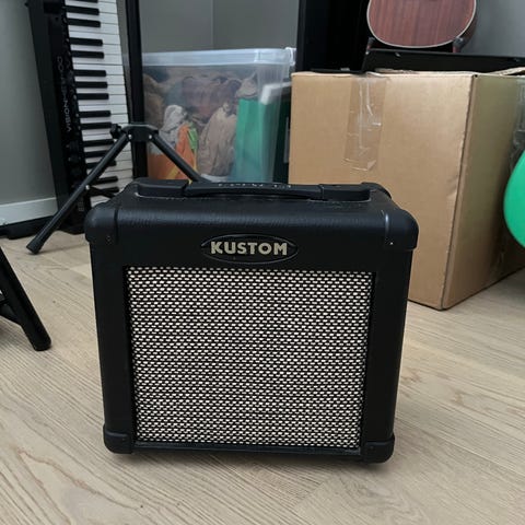 Kustom KA10 gitarforsterker i svart utførelse. Kompakt øvingsforsterker med bærehåndtak på toppen og kontrollpanel med blant annet volum- og tonekontroller. Forsterkeren har åpen bakside med plass til strømkabel. Egnet til elektrisk gitar og til bruk hjemme eller i øvingssammenheng der det er behov for en liten og enkel forsterker.