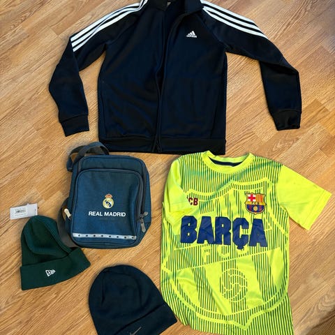 Adidas Real Madrid fotballdress for barn i størrelse 164. Sett med jakke og bukse. Jakken er lys/grønn med glidelås i front, ståkrage og Real Madrid-klubbmerke på brystet, samt Adidas-logo og karakteristiske striper på skuldre og ermer. Buksen er svart med elastisk linning, sidelommer, Real Madrid-klubbmerke på låret og Adidas-striper langs sidene. Egnet til fotball og annen fritidsbruk.
