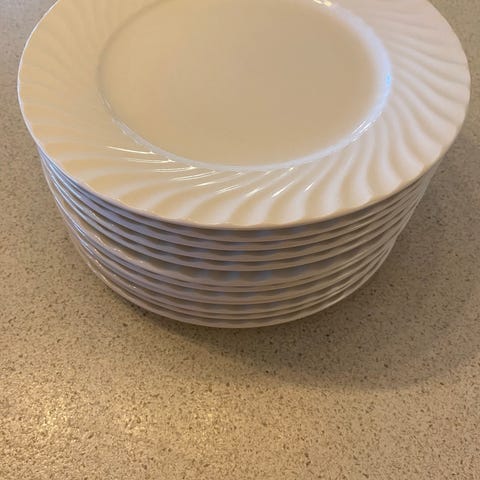 6 fine frokosttallerkner, skår i ene tallerkenen som vist på bildet.