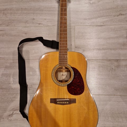 Gitaren har seks strenger, gripebrett i mørkt tre og gyldne stemmeskruer.