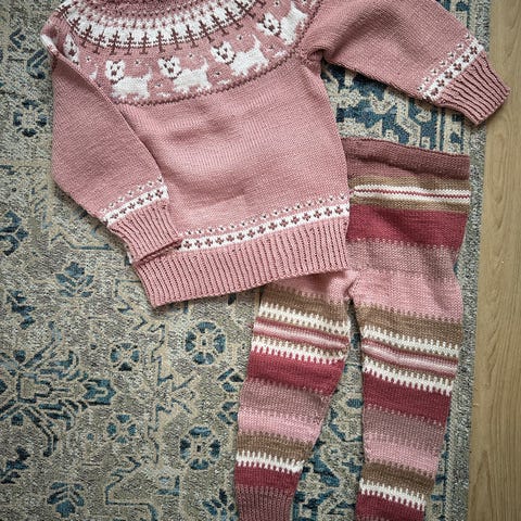 Hjemmestrikket sett bestående av kofte, bukse, votter og sokker. 100% ull.