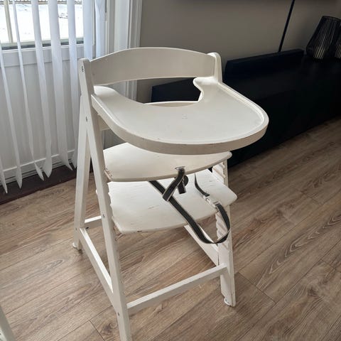 Spisestol i hvitt tre som kan senkes ned i 2 høyder og i tillegg til spising kan brukes til aktiviteter eller annet, den har stropper men dem er tatt av fordi jeg skjønner de ikke så vi brukte de ikke. Har skraper og bruksmerker men påvirker ikke bruken. Solid stol som kan brettes sammmen for å ta mindre plass.
