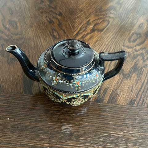 Te kanne fra midten av 1900tallet. Kjennetegn (squiggly) svinger mønster i gull over pastellfarge. Engelsk Sandler 45 stempel under. Selges for 300kr eller bud. Sender med postnord 69kr.