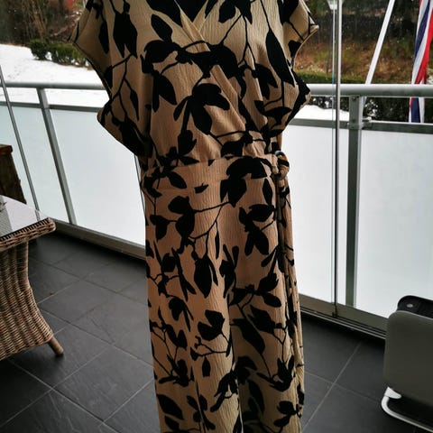 Vintage lang kjole i størrelse 38 fra Sonja Modell. Størrelse 38 i 60% viskose og 40% polyester. Brystvidde 95 cm, lengde 127 cm. Bånd som kan knytes bak i ryggen. Overdelen er innsvinget og brede folder fra hoften. Lommer i sidesømmen. Splitter i skjørtet i sidene. Brukt 1 gang.