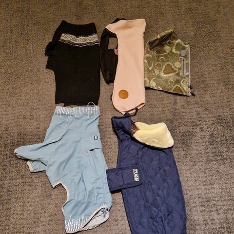 2 boble dekken fra Weater Beta str 50 (200 kr pr stk) Regn dekken fra Bucas str 50 (200 kr) Ullfleece fra Zone equestrian str XL (200 kr ) Refleks dekken ( 20 kr ) Alt er brukt på en Dalmantiner medium stor hund. Kan kjøpes separat av hverandre.