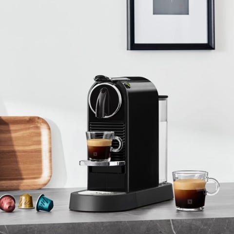 Den er beregnet for bruk med Nespresso-kapsler og har betjeningsknapp på toppen av maskinen.
